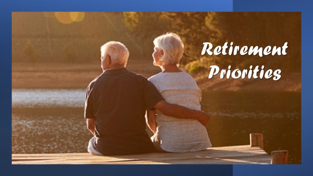 RETIREMENT PRIORITIES: I’ve had some time to think about this… Perhaps this will help someone else: My Retirement Priorities? Me and my God, My wife and family, my church, and my “neighbor” (Biblically defined)… and in that order. With God’s help and guidance I intend to “finish well!”