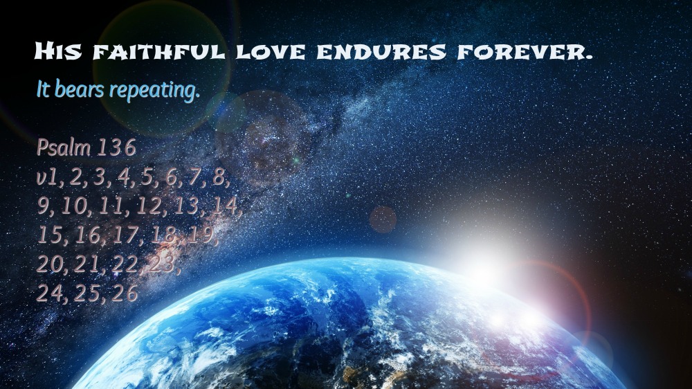 I read a wonderful Psalm devoted to that kind of love today… Psalm 136. It is like two choirs antiphonally responding to one another: One choir sings of a historical instance of God’s steadfast love, the other responds with a repeated affirmation of it (believe me, you should read it!) Here is the repeated refrain…