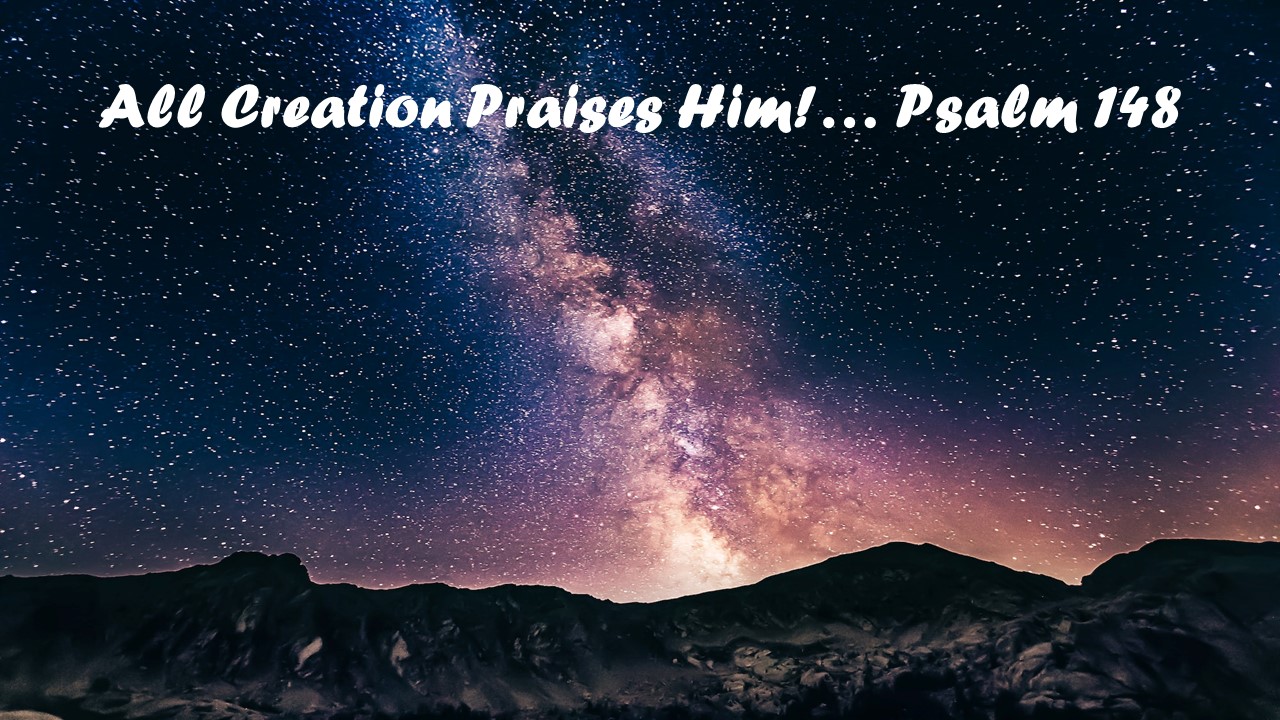 “Praise the Lord! Praise the Lord from the heavens; praise him in the heights above. Praise him, all his angels; praise him, all his heavenly hosts. Praise him, sun and moon; praise him, all you shining stars. Praise him, you highest heavens and you waters above the skies. Let them praise the name of the Lord, for at his command they were created, and he established them for ever and ever— he issued a decree that will never pass away. Praise the Lord from the earth, you great sea creatures and all ocean depths, lightning and hail, snow and clouds, stormy winds that do his bidding, you mountains and all hills, fruit trees and all cedars, wild animals and all cattle, small creatures and flying birds, kings of the earth and all nations, you princes and all rulers on earth, young men and women, old men and children. Let them praise the name of the Lord, for his name alone is exalted; his splendor is above the earth and the heavens… PRAISE THE LORD!”