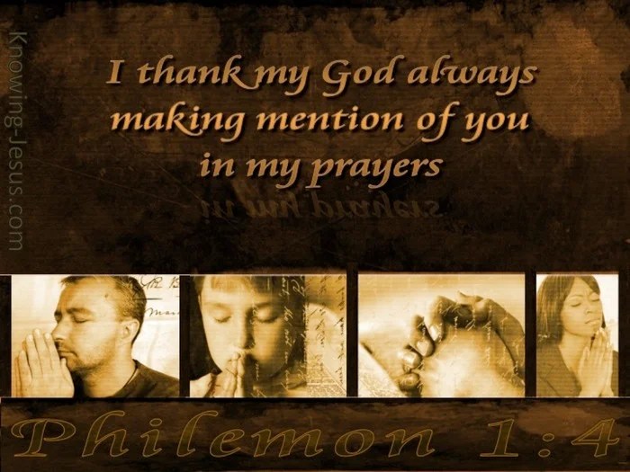 “I always thank God for you, dear friend, in my prayers! Whenever I pray for you, I recall the love and faith you have in the Lord Jesus and for all your Christian friends. In fact, I pray that whenever you share your faith it may be effective, leading to the full knowledge of all that is available in Christ Jesus. I derive much joy and comfort from your friendship and love, as have so many others!” (Adapted from Philemon 4-7)